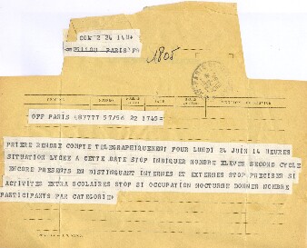 Dès le 10 mai, à Balzac comme ailleurs, des lycéens participent aux manifestations, aux grèves, se réunissent. Ils sont rejoints par des professeurs, par des parents en grève ; ensemble, une partie occupe des locaux de l'établissement. Des élèves, des membres du personnel sont absents par suite des grèves de transport. Suivant les jours, les cours qui restent, sont plus où moins perturbés ; certains sont remplacés par des discussions entre élèves et professeurs. Au collège, si les cours continuent, c'est avec un effectif réduit, car beaucoup de parents gardent les enfants chez eux. A la fin juin tout n'est pas "rentré dans l'ordre" comme le laisse supposer un télégramme du Rectorat du 22 juin 1968.