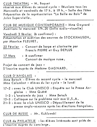 Mais, la majorité des activités entrent dans le cadre de la "Coopérative" du lycée. D'abord les clubs ; en 1965, fonctionnent : un club d'art dramatique, un club UNESCO, de danse, d'orchestre, de chorale mixte, de judo, de secourisme, de philatélie, un ciné-club (petit),un ciné-club (grand), un journal, un club d'allemand, de russe, d'anglais. La coopérative gère aussi la vente de croissants à 10 heures, de boissons, bonbons, esquimaux. Enfin, elle participe largement à l'organisation de fêtes de toutes sortes : le bal de la Mi-Carême pour les plus jeunes où le déguisement est de rigueur ; à la même date, la matinée dansante pour les plus âgés; la fête de fin d'année assortie en général d'une kermesse. A toutes ses festivités rituelles, s'ajoutent les goûters, réunions sympathiques des différents clubs.
