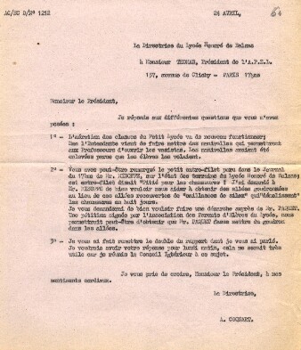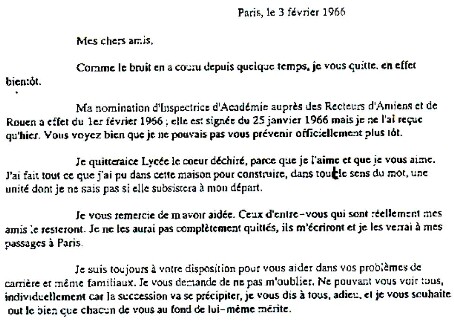En Février 1966, Mme Coquart quittait le lycée, elle venait d'être nommée Inspectrice d'Académie. Elle écrivit alors une lettre d'adieu qui montre son attachement au lycée Honoré de Balzac.