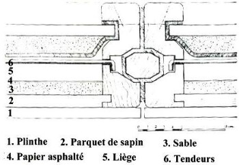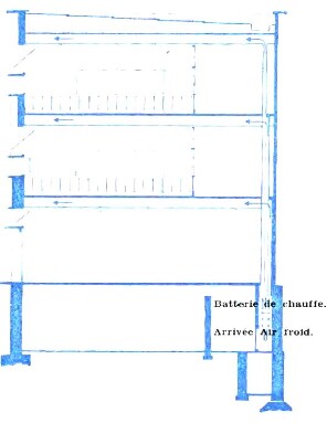 Le système adopté pour le chauffage a été celui de la circulation d'air dans le gros oeuvre. Les avantages du procédé étaient certains : suppression de toutes tuyauteries ou corps de chauffe apparent, échauffement de l'air limité à de très faibles températures en raison de l'importance des surfaces d'échange, absence de risques de gel, d'entartrage ou de fuites des canalisations (Ce système ne fonctionne plus aujourd'ui : il a été remplacé par un chauffage avec radiateurs plus traditionnel). La construction du bâtiment devait être dans une très large mesure dominée par l' établissement de ce réseau d'air chaud et par l'équilibre de son système circulatoire. Les batteries de chauffe sont installées dans le sous-sol.. Chaque unité de chauffe intéresse ainsi une travée de 1, 80m, de plancher, soit environ 20m2. Chaque batterie alimente 12 de ces unités, soit 250m2 de plancher. l'air chauffé par les batteries en sous-sol circule à l'intérieur des gaines et des planchers sans jamais sortir.