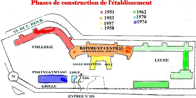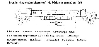 Ce schéma répond aux deux exigences qui s’imposent alorsd’une part établir parallèlement à des couloirs de circulation de longues galeries ayant la longueur d’une classe et divisibles transversalement par des cloisons amovibles en locaux de différentes profondeurs et d’autre part de faciliter le déplacement des cloisons en fonction de l’évolution des besoins (Ces cloisons amovibles ont permis en effet de nombreux changements : ainsi les plans de l'établissement présentés dans cette introduction ne sont plus dans le détail ceux d'aujourd'hui. En conclusion de cette histoire certains plans actuels seront donnés).