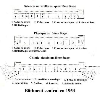 Dans le bâtiment central sont regroupés les cuisines, les lavabos, le réfectoire des élèves, la salle à manger des professeurs, etc… au rez – de chausséeles services administratifs, les salles de professeurs et leur bibliothèque, les vestiaires, les services médicaux, etc… au premier étagepuis viennent les étages des sciences au deuxième étage la chimieau troisième, la physiqueau quatrième les sciences naturelles.