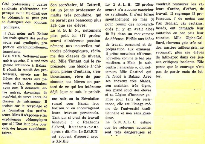 Si les élèves bougent, la sérénité n’est pas de mise non plus chez les professeurs et les parents d’élèves. La mise en place des premiers « Conseils d’administration» et en particulier de la «Commission Permanente», organisme plus restreint, déchaîne les passions. Une première Commission est élue le 11 décembre 1968, mais non conforme à la circulaire du 2 janvier 1969, elle doit démissionner et la nouvelle élue le 10 janvier 1969 ne correspond plus à la même représentation de tendances syndicales. En fait, il semblerait qu’un profond malaise règne entre la Directrice, Madame Frézoul, soutenue par certains, qui tient à reprendre l’établissement en main comme par le passé et une majorité de la "Communauté Balzacienne" pour laquelle «Mai 1968» a marqué un tournant. Les syndicats se font l’écho des divisions. Et à Balzac, les trois quart des professeurs sont syndiqués, ce qui est exceptionnel. Quatre syndicats s’affrontent. Les deux syndicats marqués à gauche, le SNES et le SGEN, favorables aux réformes dominent. Ils s’opposent au syndicat marqué à droite, le SNALC, qui trouve les réformes dangereuses. Un quatrième syndicat, formé spontanément en 1968, le GALB, est pour certaines réformes, mais dans le calme.