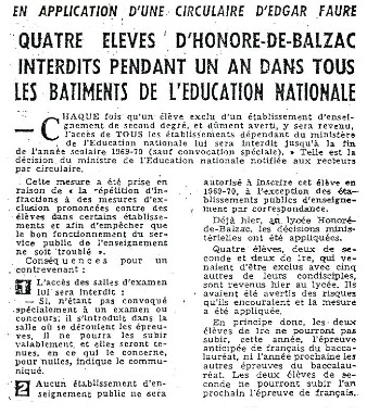 Les « feux de l’actualité » durant le mois de juin 1969 sont désormais sur le lycée. Des élèves ayant participé à l’occupation du bureau du Proviseur sont exclus par le Conseil de Discipline. Mais ce conflit intérieur est amplifié par une mesure gouvernementale, la circulaire Edgar Faure, qui interdit à tout élève exclu d’un établissement scolaire d’en fréquenter un autre durant une période d’un an. Des parents d’élèves et des professeurs, relayés par les médias, protestent contre cette décision jugée excessive.