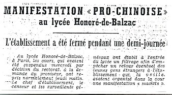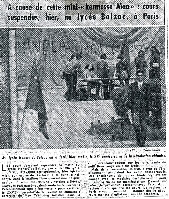 Dès la rentrée, le premier octobre 1969, toute la presse reprend les nouveaux incidents qui viennent de se dérouler au lycée Honoré de Balzac : une manifestation «pro-chinoise» a conduit le Proviseur Monsieur Domino à la fermeture du lycée pendant une demie - journée.